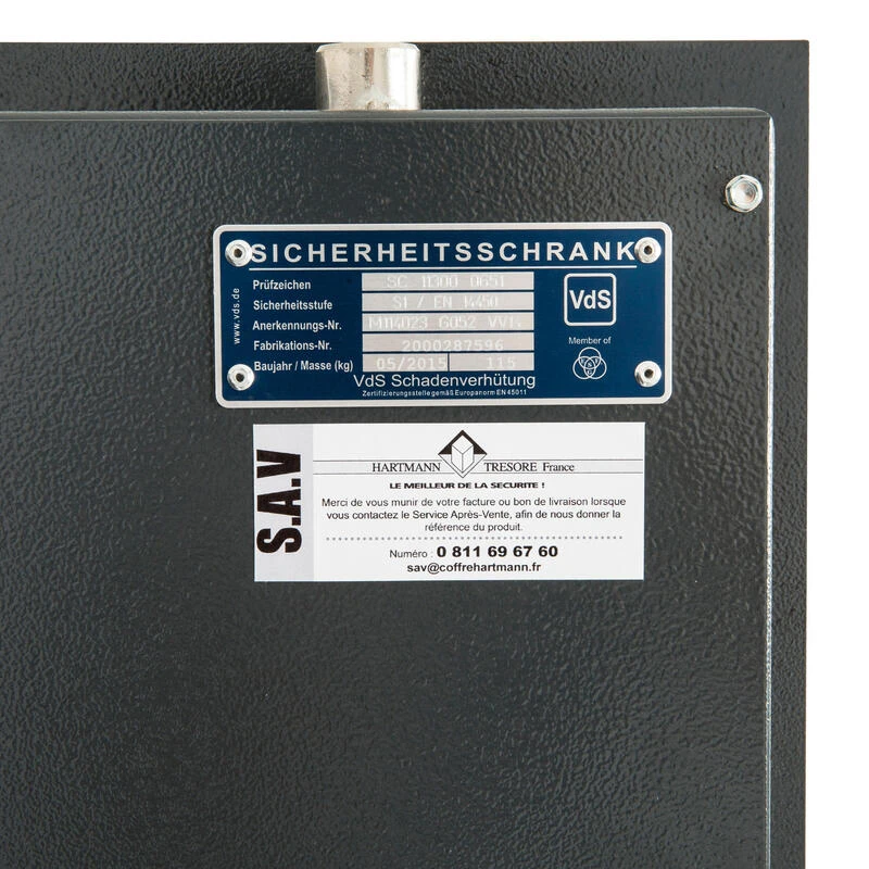 Le laboratoire VdS (basé en Allemagne) fait partie des organismes de certification les plus exigeants en Europe. Il contrôle, valide et certifie via une série de tests d’effraction, la bonne conformité de l’armoire forte selon la norme EN 14450.